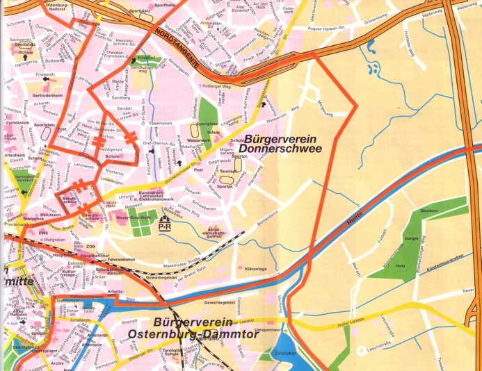 H. Lodi Str., Sandberg, Bürgerstr., Goethestr., Bürgereschstr., Lindenstr., Willersstr., Donnerschweer Str., Eisenbahnlinie Pferdemarkt bis Wasserturm/Eisenbahnbrücke und Hunteverlauf. Die Fläche entspricht den festgestellten Grenzen von Donnerschwee