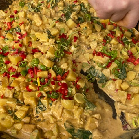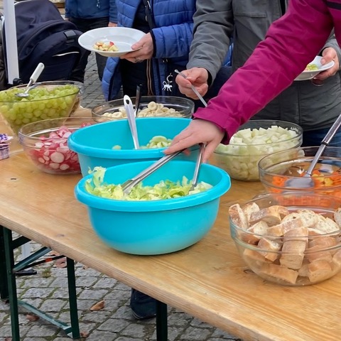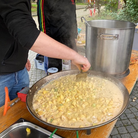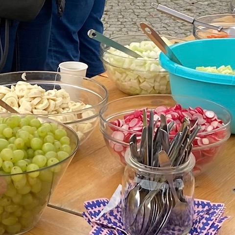 Gemeinsam mit vielen Menschen aus Donnerschwee wurden gerettete Lebensmittel geschnippelt und daraus von zwei Köchen leckeres Essen zubereitet. Zusätzlich gab es viele Infos und regen Austausch zum Thema klima- und umweltgerechte Ernährung und Landwirtschaft. Auch Ollis mobile Saftpresse war vor Ort und wer eigene Äpfel mitbrachte, konnte daraus köstlichen Saft pressen lassen. Für gute Stimmung beim Schnippeln und Essen sorgten zwei DJs und die Gruppe Offbeat Collective mit Live-Musik.